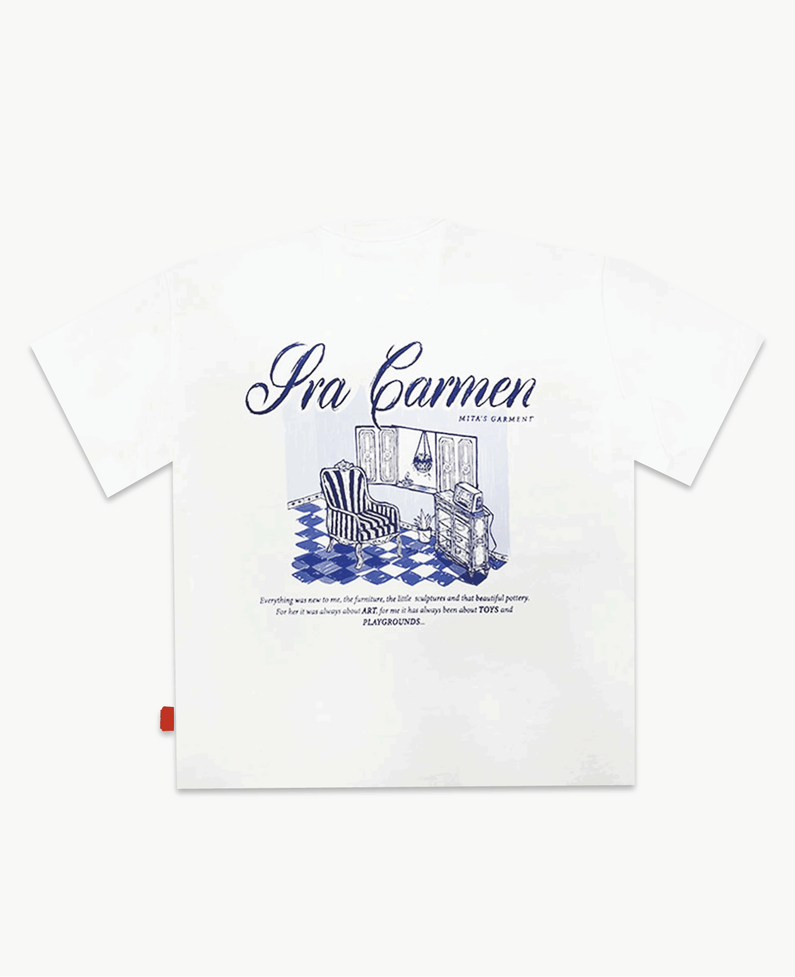 La camiseta "Sra Carmen" tiene nuestro ajuste oversize. elaborada en tela 100% algodón de alto gramaje (270g), intervenida con estampado gráfico en Textil suave de bajo texturizado, en punto corazón y espalda.